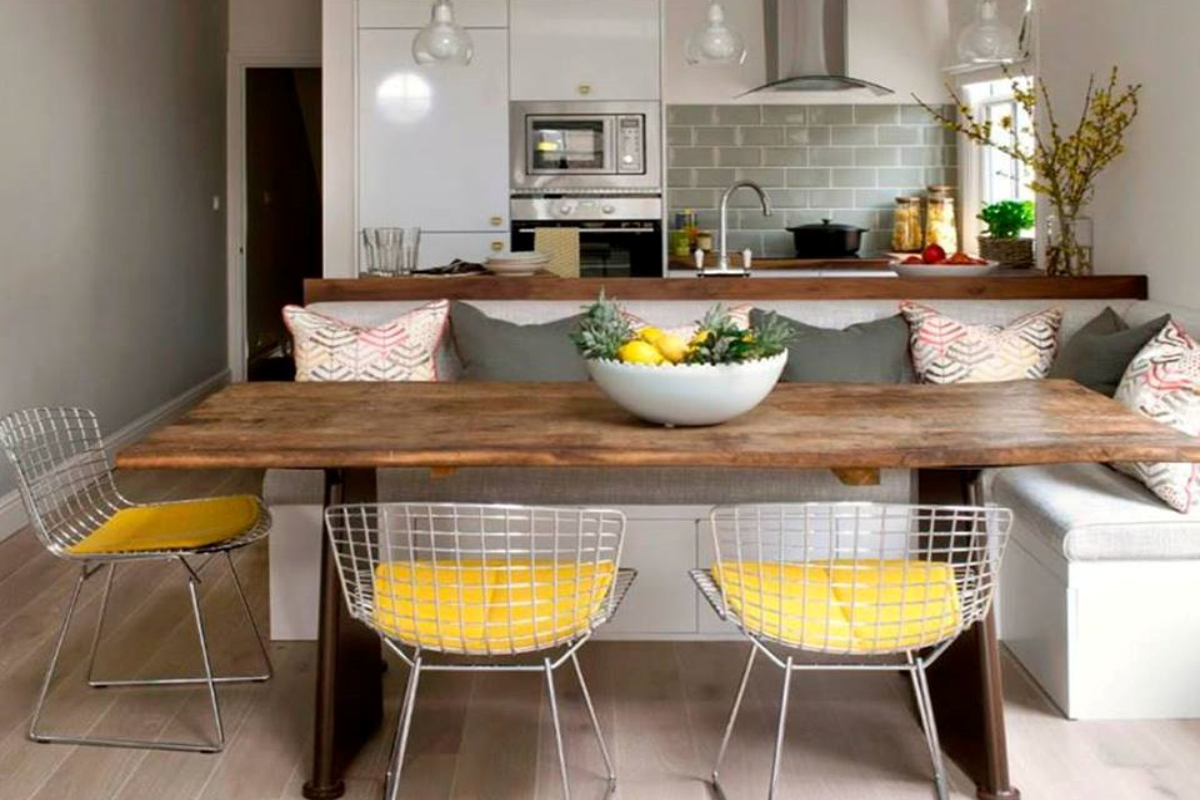O “canto alemão” nada mais é que um banco ou sofá encostado na parede, podendo ou não formar um L. A vantagem é que ele ocupa menos espaço, aumenta a área de circulação e como não possui lugares definidos, é possível reorganizar conforme a ocasião e número de pessoas. Charmoso e prático!